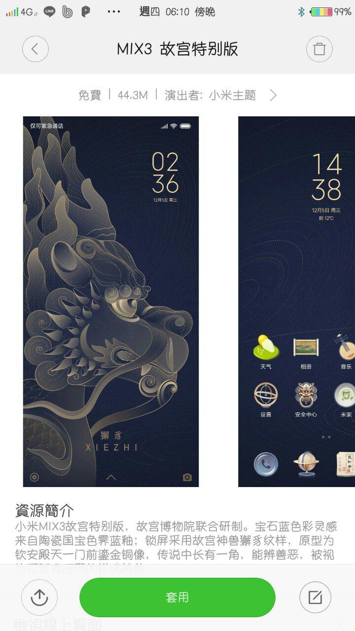 發覺小米故宮主題包好漂亮,但台灣卻無法下載不知有人可否提共該apk或下載點可下載.http://www.miui.com/thread-15808585-1-1.html另外下面這個Mix3故宮神獸主題也很漂亮,但也無法下載.是否有人有提取其主題apk