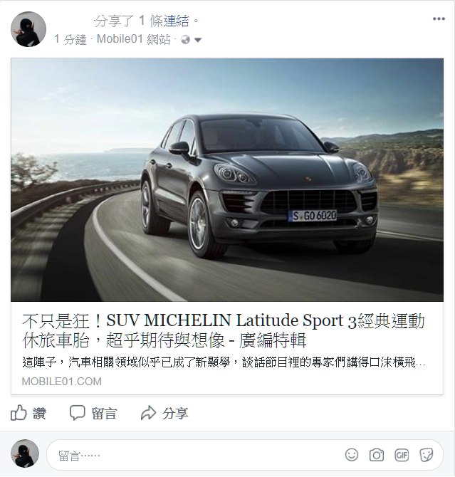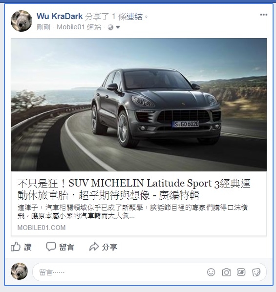我最想使用《MICHELIN Latitude Sport 3經典運動休旅車胎》挑戰濕地模式,因為全新的膠料配方及花紋設計,同時強化乾溼地操控表現,另外抓地力提升是因為全新膠料混和配方及花紋設計,降低輪胎滾動時的阻力,可有效節省能量散失,讓我挑戰濕地超放心。