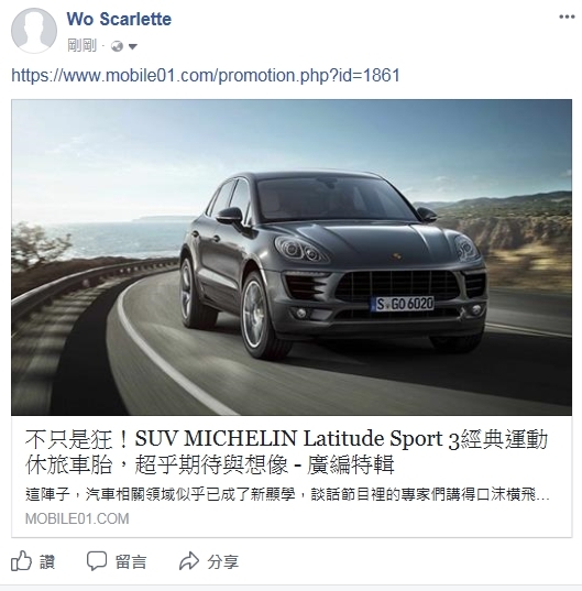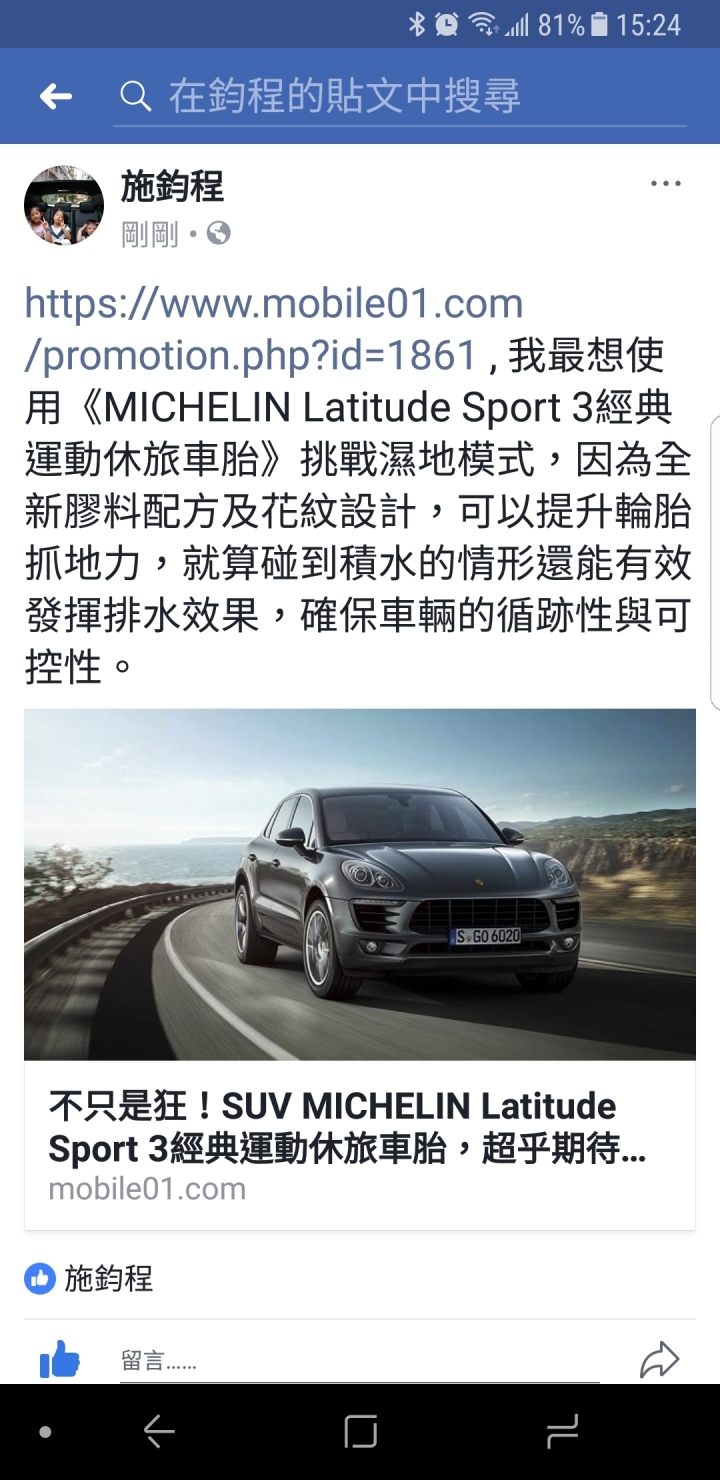 我最想使用《MICHELIN Latitude Sport 3經典運動休旅車胎》挑戰濕地模式,因為全新膠料配方及花紋設計,可以提升輪胎抓地力,就算碰到積水的情形還能有效發揮排水效果,確保車輛的循跡性與可控性。Mobile01活動小組 wrote:好東西要跟好朋友分...(恕刪)