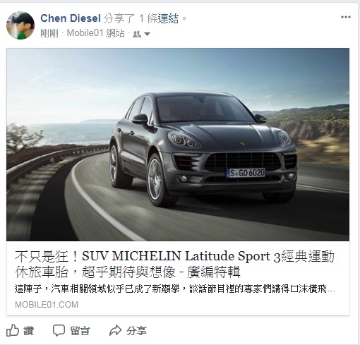 我最想使用《MICHELIN Latitude Sport 3經典運動休旅車胎》挑戰長途駕駛模式,因為MICHELIN Latitude Sport 3輪胎使用新一代高效彈性體配方,不但可以增強輪胎抗磨耗性能,也可大幅提升使用壽命,MICHELIN Latitude Sport 3輪胎擁有全新膠料混和配方及花紋設計,能降低輪胎滾動時的阻力,可有效節省能量散失,提升燃油效率,輕鬆克服長途駕駛挑戰,享受駕車樂趣!