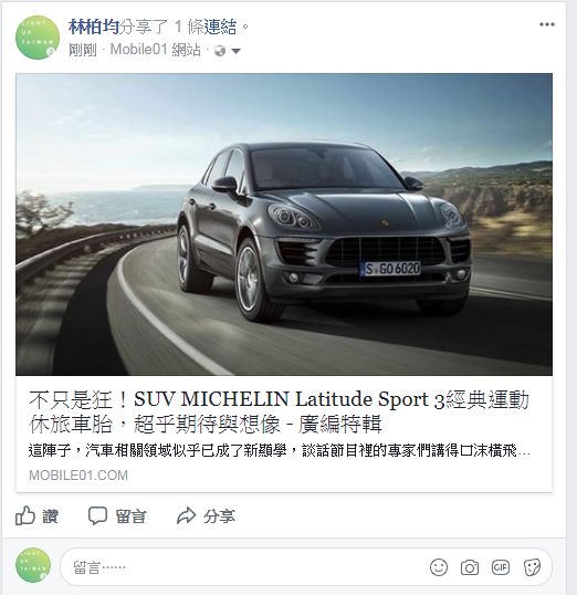 我最想使用《MICHELIN Latitude Sport 3經典運動休旅車胎》挑戰濕地模式,因為全新膠料配方及花紋設計,可以提升輪胎抓地力,就算碰到積水的情形還能有效發揮排水效果,確保車輛的循跡性與可控性。