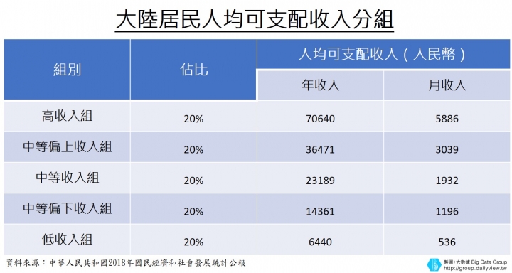 鬼點燈 wrote:何必對蛙彈琴????...(恕刪) 誰是蛙呢 ????? 好問題.....最近衛福部公告了台灣個人最低生活費用標準為每月12388元,台灣六個縣市隨之調整了中低收入戶認定標準....以台北市為例:1.家庭總收入平均分配全家人口,每人每月在23686元以下(108年度 2019年度)。2.全家人口之動產(含存款、股票及投資)平均每人不超過新臺幣15萬。3.全家人口之土地及房屋價值不超過新臺幣876萬元。核列為中低收入戶之家庭成員可以享有下列社會福利補助:1.25 歲以下子女就讀高中(職)以上學校,學雜費部分減免。2.健保自付保費補助 1/2。(18 歲以下兒童少年及 70 歲以上老人保險費全額補助)3.患嚴重傷、病,所需醫療費用,扣除已由健保給付之金額後,若應自負額超過本人或扶養義務人所能負擔時,補助部份醫療費用。4.就業服務、職業訓練、以工代賑。5.其他各縣市政府自訂之更多特殊救助及服務項目。------------大陸國家統計局發佈的《中華人民共和國2018年國民經濟和社會發展統計公報》顯示人均可支配收入平均數為28228元(人民幣),平均每月2352元(人民幣),約當新台幣10256元。大陸的人均可支配收入分配群組如次圖...統計圖文來源------台北市中低收入戶認定標準新台幣23686元(約當5400元人民幣),以此標準對照上圖大陸人均可支配收入分配群組....超過80%大陸居民在台北市是可以申請為"中低收入戶"....台灣個人最低生活費用標準為每月12388元(約當2841元人民幣),以此標準對照上圖大陸人均可支配收入分配群組....超過60%大陸居民在台灣是"最低生活費用標準"線以下群組....毛毛們....誰才是蛙呢 ?????.....你們"脫貧"的標準又有什麼可吹的 ?????