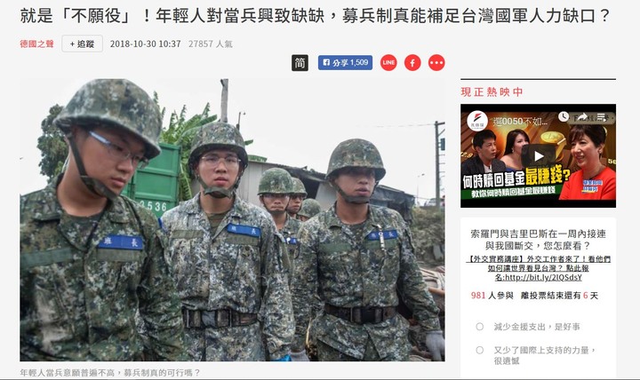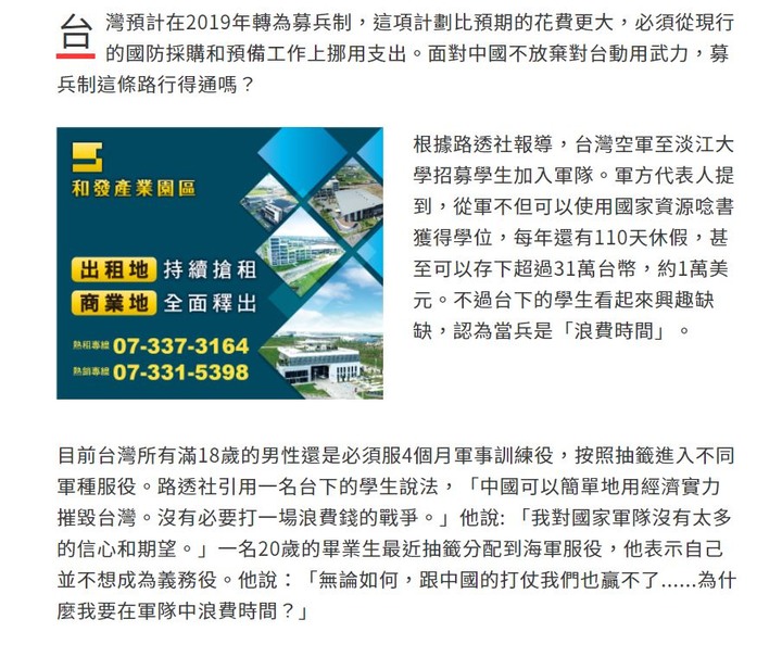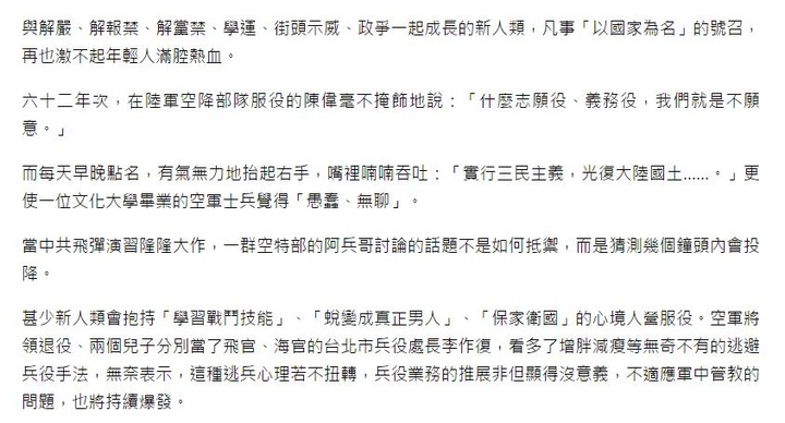 SYNBOT1234 wrote:那解放軍這種獨生子部...(恕刪) 哥笑了在1995年台灣雜誌的文章當中共飛彈演習隆隆大作 一群空特部的阿兵哥 討論的話題不是如何抵禦而是猜測幾個鐘頭內會投降結果20多年後路透社引用一名台下的學生說法,「中國可以簡單地用經濟實力摧毀台灣。沒有必要打一場浪費錢的戰爭。」他說: 「我對國家軍隊沒有太多的信心和期望。」一名20歲的畢業生最近抽籤分配到海軍服役,他表示自己並不想成為義務役。他說:「無論如何,跟中國的打仗我們也贏不了......為什麼我要在軍隊中浪費時間?」您覺得呢?