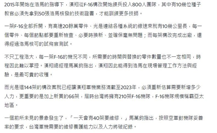 hx135cb750 wrote:平時跟戰前當然有差(恕刪) 哥笑了1994年台灣聯合報報導 中美合作建立F-16維修廠計畫將在台成立亞太地區唯一的廠級工廠建立F-16廠級維修工廠的項目包括維修技術 機具設備及零組件生產三大部份===========================================================美國人在平時幫台灣搞了亞太地區唯一的廠級工廠,結果台灣F-16妥善率只有58%在戰時台灣去哪搞定F-16 那複雜的後勤體系?