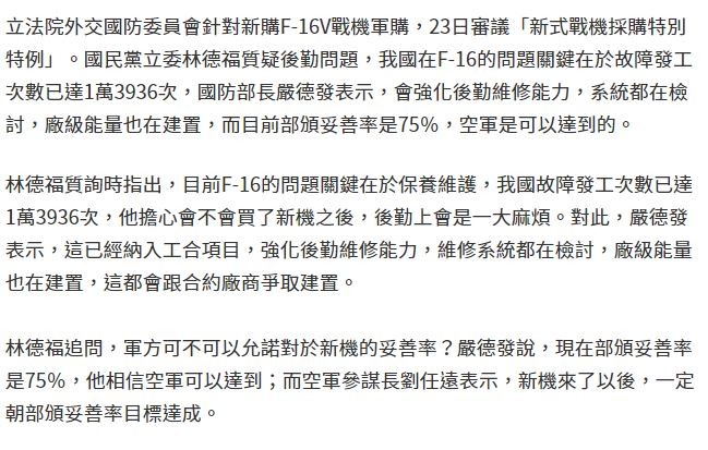 chrischenslayer wrote:這是台灣主戰裝備的妥善率 其中G是F-16 妥善率是58%但是台灣國防部長回答立委質詢妥善率75%是可以達到那兩造說法不一 請問這是粉飾太平嗎? 平時跟戰前當然有差