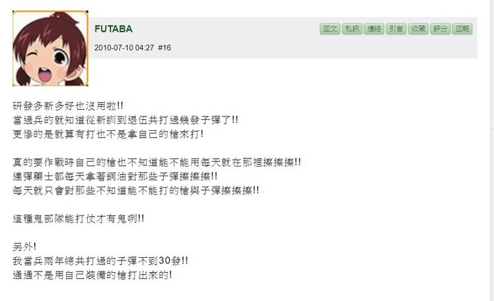 SYNBOT1234 wrote:2016-08-16...(恕刪) 哥又笑了這是本版老名人高雄旗山網友FUTABA 陸軍1762T金砲兵的回憶當過兵的就知道從新訓到退伍共打過幾發子彈了更慘的是就算有打也不是拿自己的槍來打真的要作戰時自己的槍也不知道能不能用每天就在那裡擦擦擦連彈藥士都每天拿著銅油對那些子彈擦擦擦每天就只會對那些不知道能不能打的槍與子彈擦擦擦這種鬼部隊能打仗才有鬼
