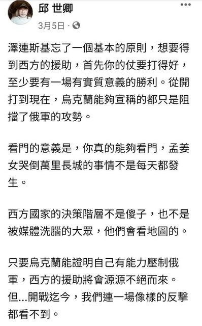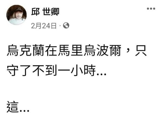 看到樓主和幾個搭擋桌頭, 乩童一搭一唱的吹著"邱老師"的英明分析.剛好看到PTT有人幫邱世卿言論作了個合集, 看了十分噴飯.名嘴嘴得一口好戰略, 兩個月後看了慘不忍睹. 原文出處睜眼說瞎話, 可憐哪.烏克蘭沒抵抗, 鵝爹旗艦爆沉是自己放火燒的, 定翼機旋翼機成百墜落只是駕駛前晚伏特加喝多了點, 坦克裝甲車成千擊毀都是鵝軍自主所為, 烏軍真的什麼都沒做. 鵝軍已經贏了, 真的, 在夢裡.