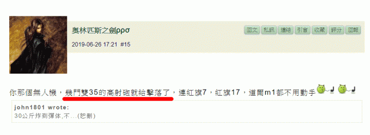奧林匹斯之劍ρρσ wrote:打臉之後繼續轉進,...(恕刪) 你是智商有問題嗎?還是語文理解能力有問題?.....沒當過兵的人、沒真正打過快速飛靶的人,很難理解前置量是不容易掌握的玩意..如果打的是不定向快速目標更難,如果面對是大量不同種類反幅射武器TOT攻擊(已公開的資料顯示國軍至少有四種以上可運用於反幅射的武器),那35炮哭爹叫娘也沒用,這樣聽懂了嗎?成天幻想體系作戰,卻是一點體系的觀念都沒有....嘴炮第一啦.....