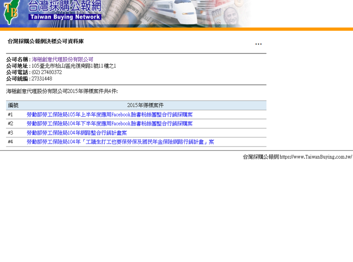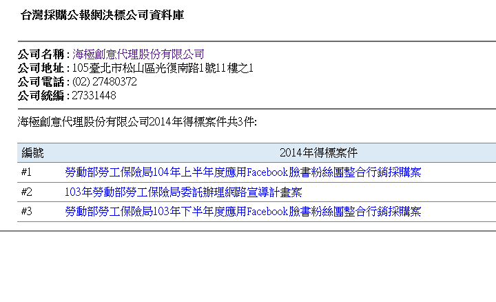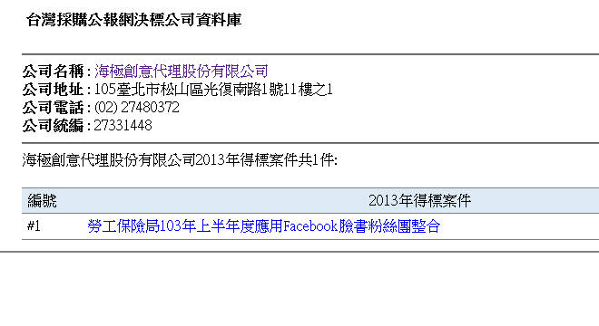 今晚要爆头 wrote:1.图片找错和我错有...(恕刪) 當然差,差別在於你認為飛彈直接放在地上是正常的所以你去找這種圖片你看的圖片有標題說美軍真實飛機嗎?還有別在天下烏鴉一般黑你以為有1450?國民黨跟特定媒體的宣傳知道被說1450的海極創意代理在幾年承包政府標案? 20132015還有2000萬的勞動部標案https://www.taiwanbuying.com.tw/ShowCCTerminateNew.ASP?CompanyName=%E6%B5%B7%E6%A5%B5%E5%89%B5%E6%84%8F%E4%BB%A3%E7%90%86%E8%82%A1%E4%BB%BD%E6%9C%89%E9%99%90%E5%85%AC%E5%8F%B8&CompId=27331448自己去看看,這就是你門口中所謂的1450早在2013年就已經為當時的中華民國政府勞動部保險局做facebook 的小編工作2015年還做了2000萬標案,這些報紙沒有說對吧,因為國民黨跟親共媒體沒告訴你2013-2015台灣誰執政?你現在說說甚麼叫做1450這裡只有共產黨的宣傳員,沒有其他宣傳員。