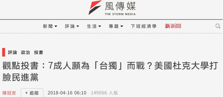 年輕人戰出來 wrote:貼這代表什麼? 跟...(恕刪) 那民調本身就是個議題, 他查的是台獨而戰, 這當然引不起高民調, 只要改成為保家衛國而戰, 那結果就會完全不同. 況且從來沒台獨的問題, 只有陸獨的問題, 中共 1949 年宣佈獨立, 完全背棄了中華民國.