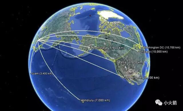 从上图可以看出,从舞水端发射基地到关岛为3400公里,到阿拉斯加州最大的城市安克雷奇为5600公里,到西雅图为7900公里,到洛杉矶为9100公里,到芝加哥为10000公里,到华盛顿特区为10700公里。