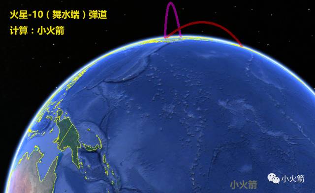 在小火箭2017年2月份的公号文章中,小火箭给出了火星-10(舞水端)弹道导弹高抛弹道(紫色)与作战弹道(红色)放在一起的样子。在同样的弹体、动力和控制系统的情况下,这两条弹道可以说是同样一枚导弹在装订了不同的飞行策略后飞出来的弹道。按照小火箭好友给出的数据,去年朝鲜的高抛弹道试验,导弹最大飞行高度达到了1413.6112千米,导弹命中距离发射车400公里的目标区域。能够实现这样的高抛弹道飞行的话,通过重新设定制导控制系统,导弹是能飞到2700多公里以外的。