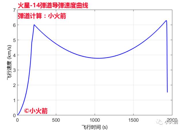 小火箭计算的火星-14二级弹道导弹携带400公斤弹头攻击6333.5公里处的目标的速度曲线。