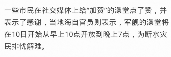 一些市民在社交媒体上给“加贺”的澡堂点了赞,并表示了感谢,当地海自官员则表示,军舰的澡堂将在10日开始从早上10点开放到晚上7点,为断水灾民排忧解难。