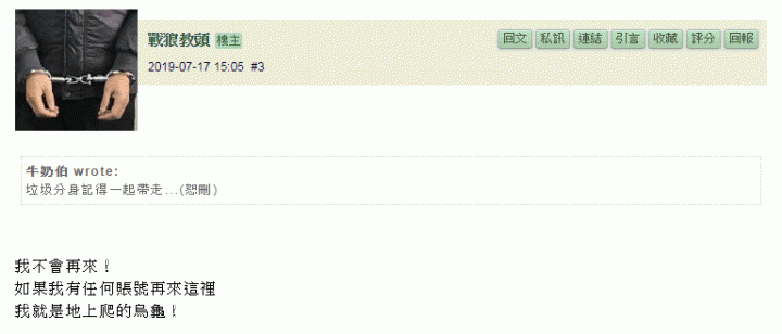 牛奶伯 wrote:第N次告別軍版的烏龜...(恕刪) 是我之前說話不算話n次但這n+1次是最後一次因為這邊不是扣帽子就是辱罵一點意思都沒有還有人說什麼伯爵,piwu是我反正就是扣帽子唄我以後去香討論壇了!