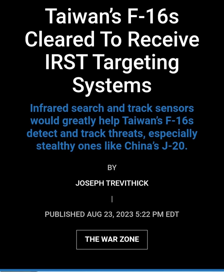 這篇有關台灣這次的報導很精采文章內的數個副本連結到之前的文章legion pod不只是個簡單IRST而已整合機上雷達電戰外各個戰機上的legion pod還有獨特的聯網能力,能一起構成更完整的戰場感知圖像https://www.thedrive.com/the-war-zone/taiwans-f-16s-cleared-to-receive-irst-targeting-systems