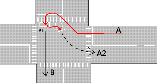想說等燈號 綠燈 就跟著 汽車 一起 轉回 她原來 過來的方向(A2)...