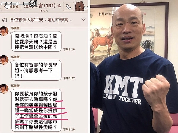 球德洛 wrote:這位「邱議瑩」在一個「道明…會」的LINE群組上提到,「開賭場?挖石油?開性愛摩天輪?還是直接把台灣送給中國?各位有智慧的學長學姐…冷靜思考一下吧!你要教育你的孩子發財就要去賭場嗎?你要你的老婆讓韓國瑜睡一晚,當成是你提供了工作機會之後的報酬嗎?你要這個城市只剩下賭與性愛嗎?」...(恕刪) 安基拉 wrote:民進黨這些女的怎麼都如此不入流,前有御用攝影師幫未婚女主人偷拍主人心儀之人的下體,現在又來一個想陪睡幫老公找工作的,嘖~嘖~嘖~真是有夠噁心的~ 想陪睡幫老公找工作? 這女的講話真骯髒。
