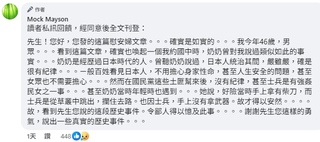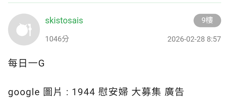 rexjian wrote:不論國籍黨派,誘騙或強徵慰安婦都是不人道、不公義的事。只是要談這麼嚴肅的歷史議題,好歹也找個有名有姓的人吧?慰安婦阿嬤都敢挺身而出具名控訴,結果寫的人怎麼不敢以真實身份示人而是個莫名奇妙的臉書帳號?再說一次,慰安婦是不公義的事情,那個一再po文暗示日籍慰安婦自願說的,樓主倒是視而不見,請問是是分身帳號嗎? 我哪邊視而不見你就說咩~我沒PO文就視而不見,那你自己呢??哪個PO文說日本慰安婦是自願?01嗎?光回你們這種無腦文,我就沒空看01其他人PO文的好嗎~你以為我每篇都回每篇都看啊?用點腦好嗎?我有空才去看別人PO文回文~我可沒每篇都看~誰像某些網軍槓精閒每篇回每篇開槓的我建議你去看電影"大濛"
