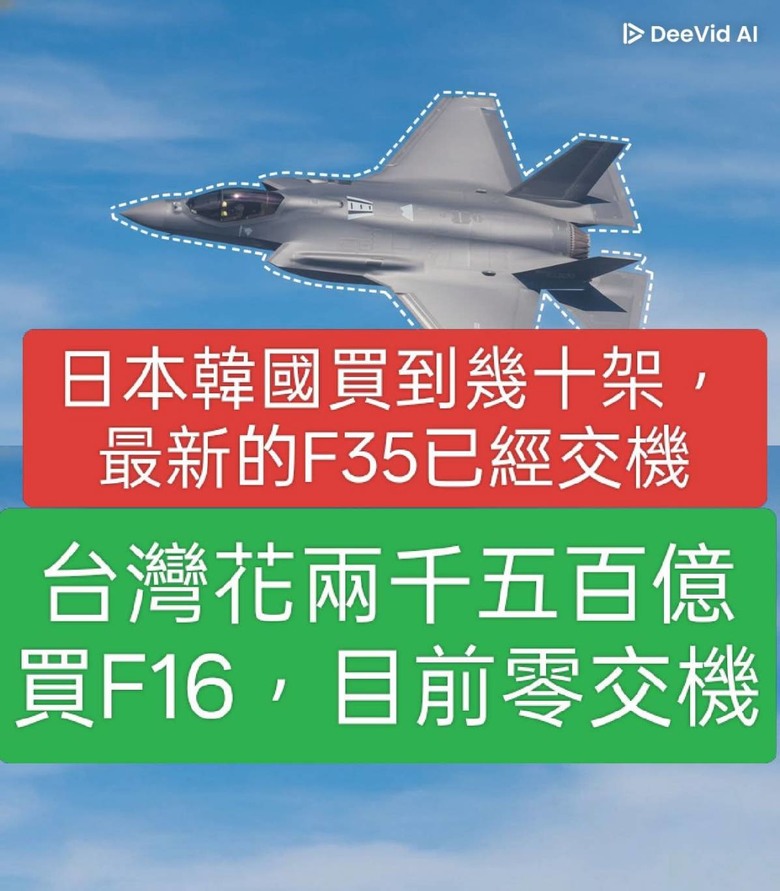 larry-han wrote:這樣說不太公平其實美方有出了一架展示機但是韓國採購F35單機價格落在 7,790 萬美元日本採購了兩個型號F-35A 單機造價約為 $7,790 萬美元F-35B 單機造價約為 $1.013 億美元台灣F16V單機價格 約1.217 億美元明顯貴那麼多貴就是好,好東西值得多等待一些時間的! 綠人及輪子說了,只要台海戰爭,美國就會為了保護台灣,派兵跟中國死戰到底,玉石俱焚也在所不惜。美國都肯為台灣不計代價犧牲奉獻了,買賣貴一點就不要計較了。
