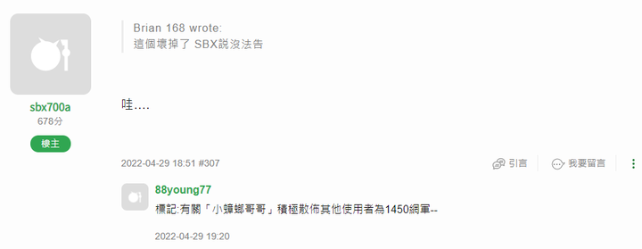 sbx700a wrote:哇.... sbx700a 你說要經過司法給我學習成長的機會,為什麼 2021-07-19到今天2022-04-29 我就是沒有收到任何應訊通知。你不是很愛詢問承辦人進度嗎?去確認我的進度不難吧?要堵悠悠眾口就請貼出我的案件受理單,你的誠信才會張揚出來。
