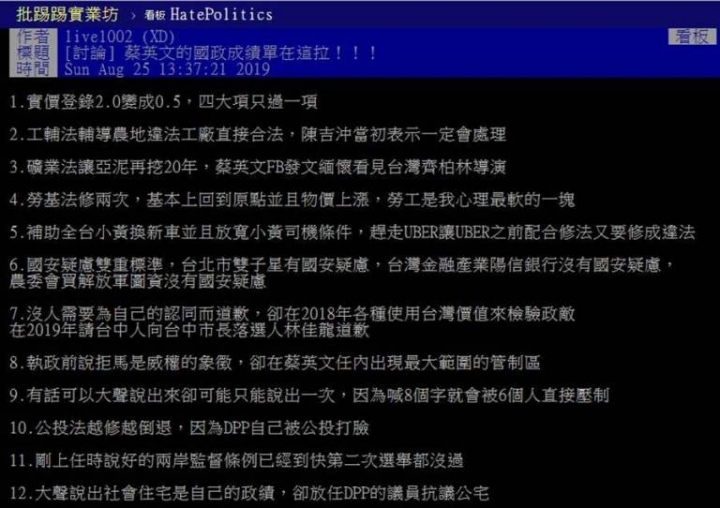 雙標黨不意外,希望網友別當雙標人....自損陰德!網整理小英36次超扯「事蹟」第一,「實價登錄2.0」變成0.5,四大項只過一項。(2019年7月立院三讀)。第二、《工輔法》輔導農地違法工廠直接合法,農委會主委陳吉仲當初表示一定會處理。(2019年6月27日立院三讀)。第三、《礦業法》讓亞泥再挖20年,蔡英文FB發文緬懷看見台灣齊柏林導演。(交付立院後,尚未三讀)。第四、《勞基法》修兩次,基本上回到原點並且物價上漲,「勞工是我心理最軟的一塊」。(2019年4月26日立院三讀部分條文修正,2016年11月13日,蔡總統接受媒體專訪時表示,勞工是「我們民進黨心裡最軟的那塊」,但是「中小企業也是民進黨的夥伴」,為了顧及中小企業的經濟動能,這個階段必須砍七天假。)。第五,補助全台小黃換新車並且放寬小黃司機條件,「趕走UBER」讓UBER之前「配合修法又要修成違法」。(《汽車運輸業管理規則第103-1條》)。第六,國安疑慮雙重標準,台北市雙子星有國安疑慮,台灣金融產業陽信銀行沒有國安疑慮,農委會買解放軍圖資沒有國安疑慮。(8月初農委會遭媒體踢爆花千萬請大陸衛星拍台灣)。第七,沒人需要為自己的認同而道歉,卻在2018年各種使用台灣價值來檢驗政敵。在2019年請台中人向台中市長落選人林佳龍道歉。(2016年1月6號,蔡英文勝選演說。8月17日蔡英文赴台中辣台派開講)。第八,執政前說拒馬是威權的象徵,卻在蔡英文任內出現最大範圍的管制區。(2018年1月,時代力量黨赴總統府抗議勞基法部分條文修正,總統府周圍畫下史上最大管制區)。第九,有話可以大聲說出來卻可能只能說出一次,因為喊8個字就會被6個人直接壓制。(6月30日蔡英文公開訪行程上,一位圍觀民眾在維安人牆阻隔之外喊了句「蔡英文還我公投,還我民主」,被6名維安架離壓制在草地上。)第十,公投法越修越倒退,因為DPP自己被公投打臉。(公投修法6月17日三讀通過,2021公投與大選脫勾)。第十一,剛上任時說好的兩岸監督條例已經到快第二次選舉都沒過。(立院內政委員會今年4月17日審查朝野立委6版本,因名稱、條文沒共識,召委林為洲宣布全案一併保留送朝野協商)第十二,大聲說出社會住宅是自己的政績,卻放任DPP的議員抗議公宅。(2017年民進黨籍市議員張茂楠、洪健益抗議公宅招標黑箱作業)。第十三,為了拔掉一個管中閔五院齊攻,結果自己掉了三個教育部長,前教育部長吳茂昆未申請就違法赴陸。(卡管案引起社會極大爭議,3教育部長請辭下台,潘文忠、吳茂昆、葉俊榮,註:潘文忠後回鍋任職教育部長)。第十四,謝系大將謝明達涉收賄,一夕無罪定讞。(2018年8月18日最高法院改判謝明達無罪,該案纏訟17年8個月,歷經15位法官)。第十五,缺電擴建深澳燃煤電廠,說評估已經很久非常需要,不然台灣會缺電,卻一夕之間又有電。(蔡總統競選時說「台灣不缺電」、「台電藏電」,所以要推動「非核家園」,上任後停核四,改口缺電,不但讓基隆協和燃煤電廠延役,更啟動深澳電廠重建,時任的賴揆又說經濟部盤整後,認為若「三接」天然氣未來足以因應,深澳可以停建)。第十六,總統上街帶頭反核,差不多同時開放核二使用。(2019年4月27日蔡英文參加反核大遊行,隔不到一個月,核二5月25日正式併聯運轉)。第十七,選前喊台灣正名,選後說中華台北是國際慣例沒有矮化。(衛福部長林奏延在WHA大會演講中,一反過去慣例,全程以中華台北自稱,台灣兩個字隻字未提。後蔡英文定調,稱謂上沒有矮化問題)。第十八,DPP立委凍結勞檢預算。(因行政院勞動部2017年送交立院單位預算表,勞檢尚有爭議事項,遭立院民進黨立委凍結該筆29萬預算)。第十九,為了通過勞基法派出自家立委,把杯葛中的立委直接抬出場。(2017年11月20日立院社福及衛環委員會初審勞基法修法,時代力量立委徐永明杯葛霸占主席台11小時,民進黨立委陳明文、蘇震清兩人一前一後將徐永明,拉手加熊抱拖出場)。第二十,蔡英文說過勞動部不要太為難企業,勞工不能加班心中痛,研議微型企業違反勞基法免罰。(勞動部5月13日表示,研擬違反《勞動基準法》裁處罰鍰共通性原則」,將朝著微型企業不罰等方向進行,具體修正內容,將參酌各界意見,審慎研議)。第二十一,民進黨立委、議員多人幫腔葛特曼抹黑葉克膜用於活摘器官,使得台灣願意器官捐贈人數降低許多。(2018年10月2日《屠殺》一書,作者伊森.葛特曼召開國際記者會指控台北市長柯文哲「是騙子(Liar)」,還質疑柯助長活摘器官行為,是「最糟(the worst)的部分」。(時任立委姚文智、民進黨市議員王世堅皆曾在此事重話批評過柯文哲)第二十二,使用酒駕前科當行政院發言人。(現任行政院發言人Kolas Yotaka谷辣斯•尤達卡,過去在擔任記者時,曾於2014年8月酒後駕車)。第二十三,香菸萬條免稅定調「超買」,說是「走私的就是在操弄」。(國安單位藉蔡英文出訪,夾帶私菸企圖入境。蔡英文首度在總統府受訪時提及此次案件為「涉嫌違法超買免稅菸品的陋習案件」,且總統府在記者會也稱此為「超買」。引起民怨。本案因近期爆發,已進入司法階段)。第二十四,選前說要把集遊法改報備制,選後擋修集遊法改報備制。(立法院內政委員會在2016年5月12日已初審通過集遊法修正草案,將「申請許可制」改成「自願報備制」,並更名為「集會遊行保障法」,取消現行法所有罰則;但包括是否設置禁制區、命令解散權等,因各黨