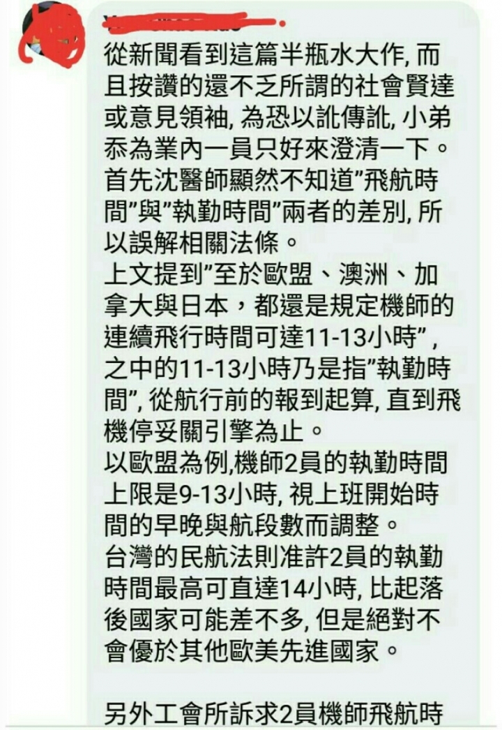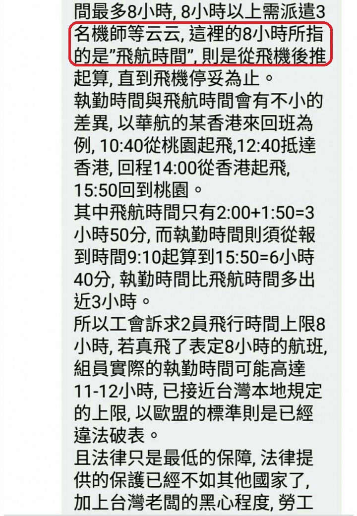 工會訴求的8小時是飛航執勤時間,不是你分享文章說的飛航時間