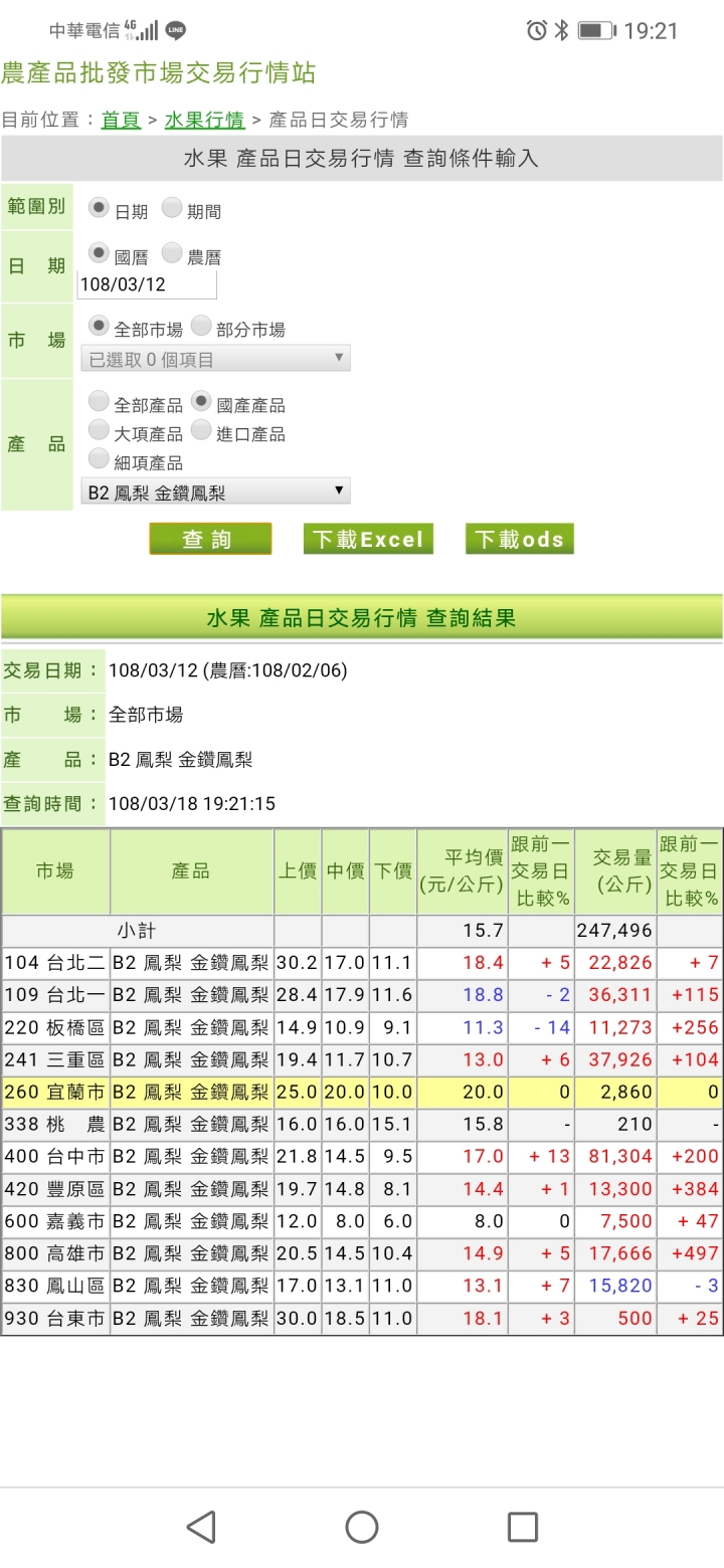 現在農產市場都是公開可以查的資訊各位說的價格最差的嘉義鳳梨 交易如下交易日期:108/03/18 (農曆:108/02/12)市 場:全部市場產 品:B2 鳳梨 金鑽鳳梨查詢時間:108/03/18 19:10:49市場 600 嘉義市B2 產品鳳梨 金鑽鳳梨 上價13. 中價08. 下價06. 平均價(元/公斤 08.00) 跟前一交易日比較% 交易量(公斤) 12,000+