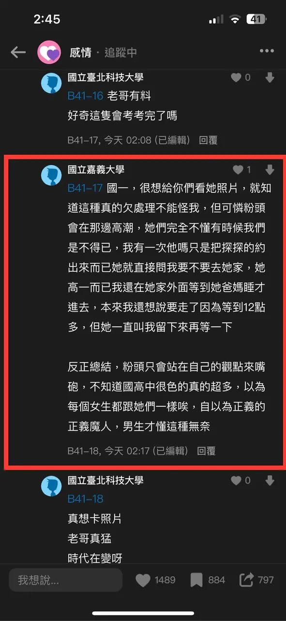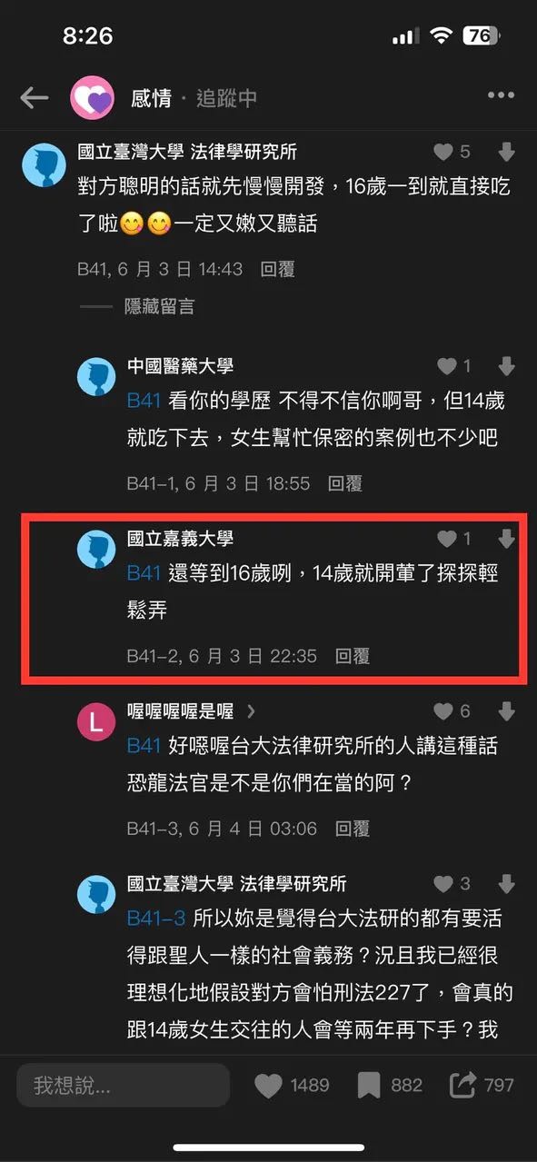 起因: 有名嘉義大學男子在網路貼出與未成年少女性交之相關對話與留言,細節描繪程度到進行姿勢、女性性器官鬆緊度...可見附圖
