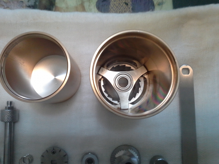 開箱照片來囉…這版本是將上支架形狀改成3爪式便於進豆,及上、下軸承換成一樣的型號,統一規格,還不錯。初收到時的確還是有加工的油耗味,拆解清潔後,目前使用上非常滿意。個人覺得這款匿名2一個很棒的設計就是完全不需任何工具即可完成拆解及組裝,而且公差還滿小的,有些地方拆裝時要輕輕的,避免拆裝多次後公差變大。