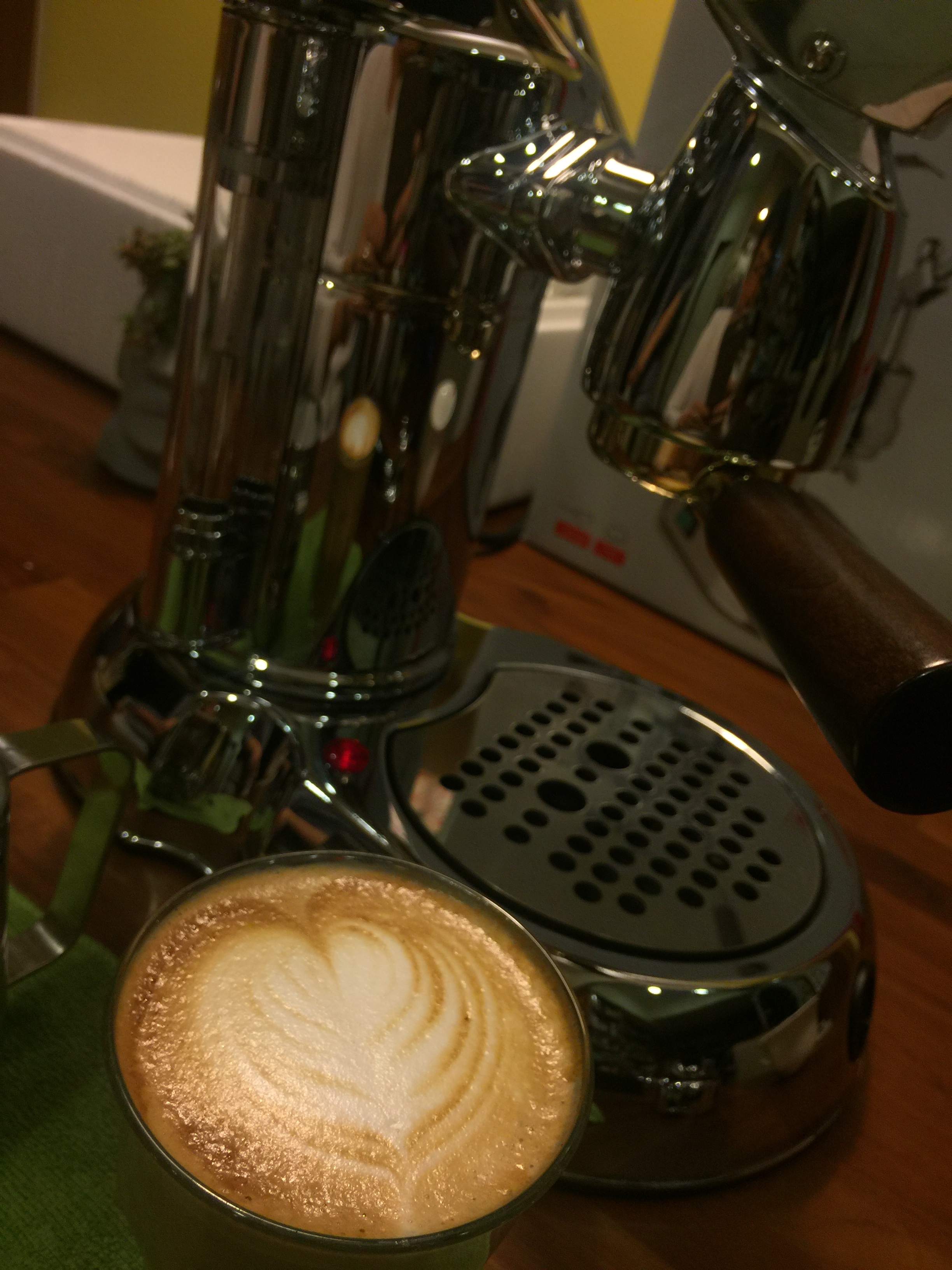 - 自評:因第一次使用 STRADIVARI,奶泡不是打的那麼順手,使得奶泡過粗…拉花不是那麼完美,結巴中……嗚~自己去旁邊罰站!