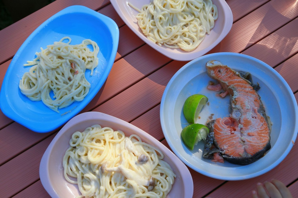 ↓先填飽肚子再來介紹一下營地,今日菜色:白醬蘑菇義大利麵加煎鮭魚