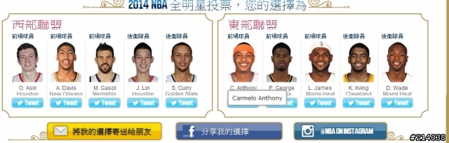 首先當然先找林書豪囉!!!一定要支持一下了投給"厄文"當然是要看他那誇張的過人技巧,還有腳踝終結者...投給萌神咖哩就是要看他投3分拉其他不多說了,KOBE不用說了投也是白投,甚麼時候能上場還不知道哩有點猶豫要投給"幹籃哥"還是"一估打蠟"大家也分享一下投票結果附上投票網址http://goo.gl/1Vo7uC