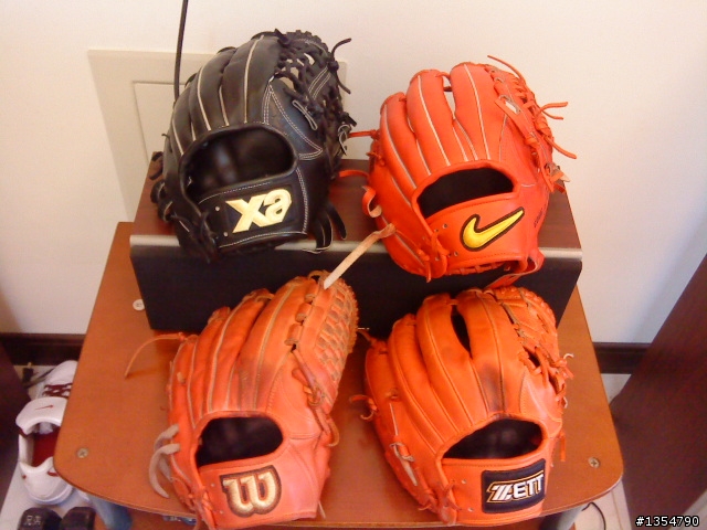 大家好~~新人一個~~~看到大家貼手套~~趁今天保養時候順便拍了張照片~~傷大家眼睛還請包涵喔護婉:MIZUNO PRO 雙層刺繡棒子:SAM BAT 訂做款(還有三支不在身邊就沒拍了)手套:由左至右金標硬式(一朗)<金蔥標硬式(高橋24)<MIZUNO白鳥標軟式(一朗MODEL高橋球擋)<SSK硬式ORDER紅色一壘手:HA日製硬式ORDER原皮色一壘手:HA日製量產黑色一壘手:Rawlings軟式量產另有兩硬一軟MIZUNO ORDER(一硬一壘手一硬外野一軟外野)~目前外借中所以沒拍囉)大家有機會可以經驗交流喔~~手套應該比較沒機會交流啦~"~
