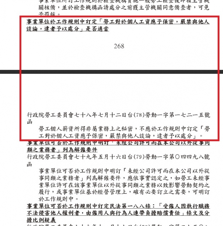 勞工個人薪資所得非屬業務上之秘密,不應於工作規則中訂定┌勞工對於個人工資應予保密,嚴禁與他人談論,違者予以處分┐。