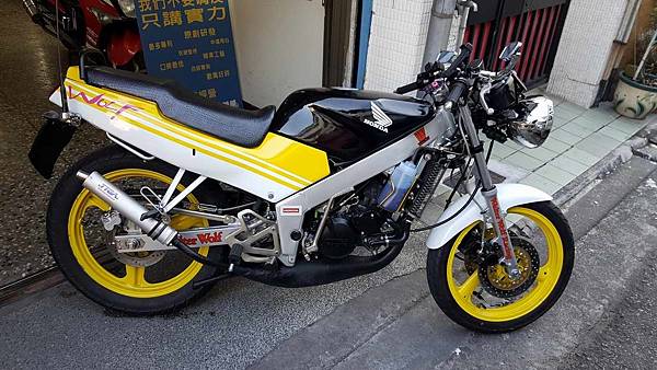 - Honda NSR150 一期車,整流罩材質厚實但外觀尺寸較小,引擎及主要零件由日本原裝進口,全車則在台組裝完成。