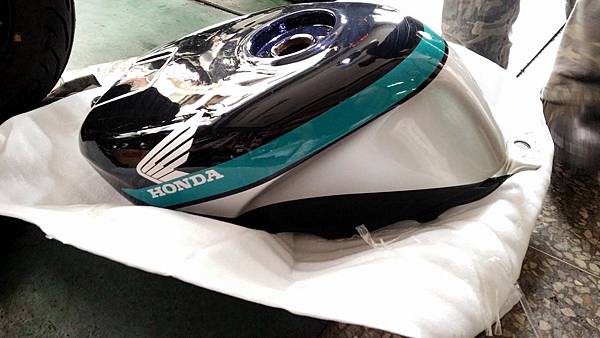風燭殘年的油箱),想要全部整新修補做防鏽後,指定改為本田1994 NSR250SE 經典配色