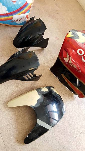 老車零件如老酒一樣,越陳越香,越陳越貴!一組前殼(整流罩)要價新台幣動輒近萬元之譜(全套殼更貴,而且肯定不同色,就算買到手還是需要重新整理烤漆配色),其實這也是合理!畢竟年份越久,物資越少,端看車友們的經濟能力,經濟允許就跑日本線一套帶回同一色系,一次滿足,而另有想法的玩家則是走其他路線,或是像我一樣,口袋淺經濟預算低,我就來走老殼修復整新重考配色的路子。