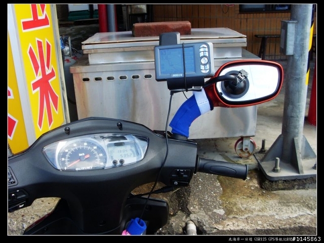 GSR125改裝GPS車架圖片分享小弟第一次發文,若有不周之處,請多指教步驟一:點煙器安裝:一些電子材料行有賣七十到一百多,安裝方式,正電接KEY孔正電,負電接地夠簡單吧,另一些機車行也有代客安裝,可以去尋問看看,Y拍上面滿多這方面資訊的。步驟二:安裝車架與GPS看到這張圖應該夠清楚了吧小弟是用吸盤式的車架,只要玻璃夠乾淨,這種扣壓式吸盤,吸力真是沒話說,小弟吸完北海岸一圈,來回約一百多公里,全程時速約七十公里上下,還是穩穩吸住。當然最好還是找幾條髮圈或魔鬼貼在重要的地方加牢,在突發狀況時還能綁牢不飛出。其它角度