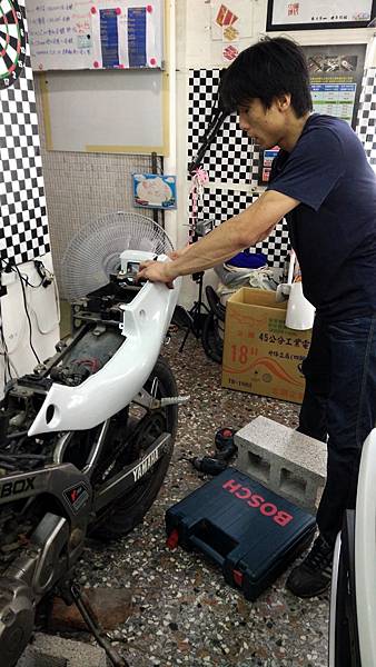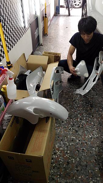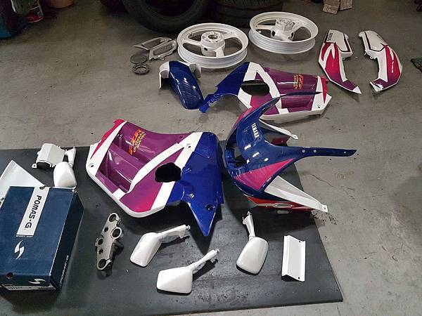 FZR 150全新車殼,車友支援油箱等上午送到,中午立即送至好友巫董超級車廠準備來個世紀完美彩繪烤漆之旅
