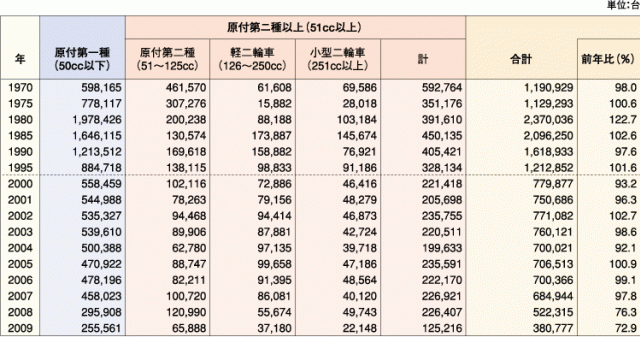 以2009年來論,日本二輪車量有380,777台,其中光50cc以下車種就有255,561台。但日本並沒有因此獨限發展50cc以下車種,250,400,甚至公升級以上都還是持續有新車推出,而且部分車種甚至只限日本販售,如KAWASAKI最新的噴射男子漢