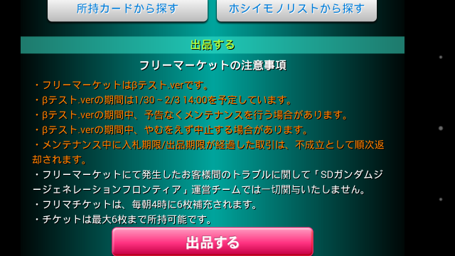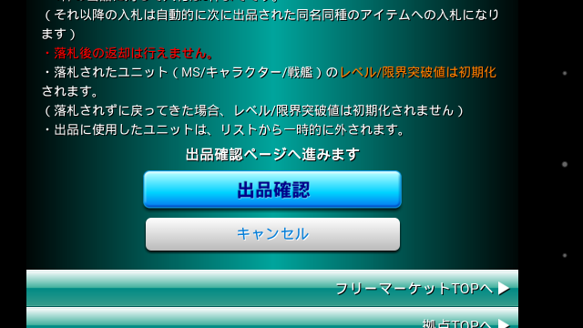 一開始進去後拉到最下面就可以看到出品然後點下去後會進去藍色的點下去就開始把你不要的卡拿出來換當然可以選戰艦啦,op啦,人物還是機體,記得點完旁邊那顆要按一下才會跳目前先掛一張克魯澤試試行情選完後記的要往下拉確定確定完再往下拉點紅色的出品系統會告訴你好像還可以放5張吧?最後在跳出來去看上面那3顆的出品就可以看到你自己出的東西,然後下面應該是別人出的,但因為剛出還不能看所以晚點再來看看囉大概就是這樣吧至於要怎麼看到別人出的,我還沒去研究,因為我都只看到R跟R+的卡而已,所以有時間研究完再PO圖吧,哈哈哈