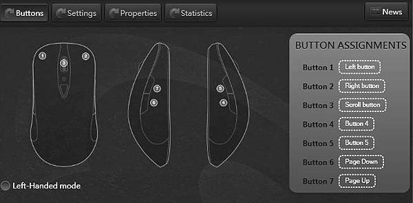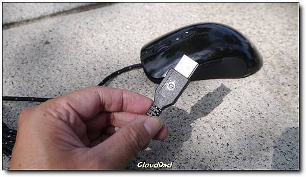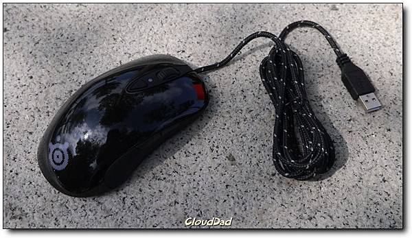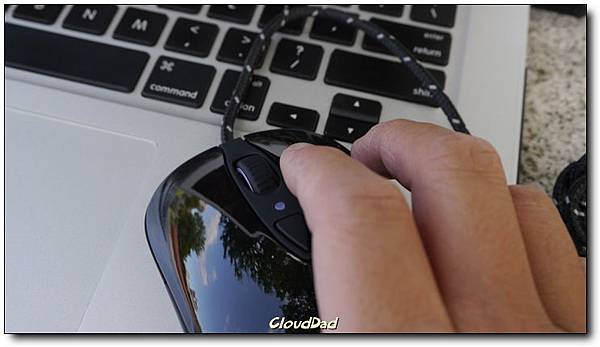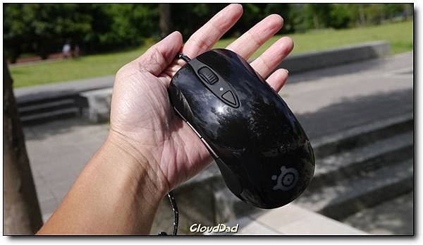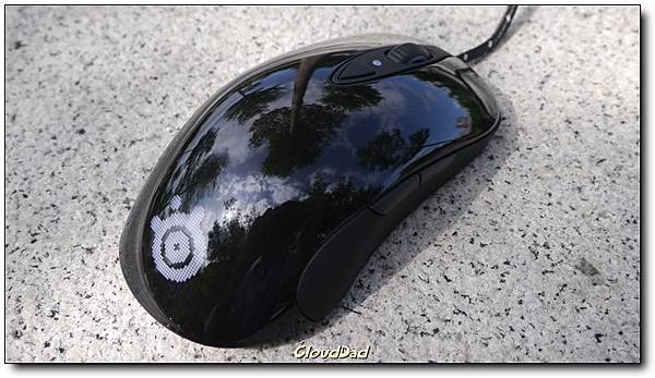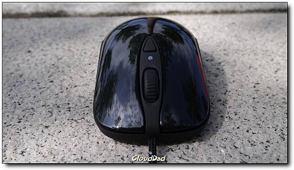 SteelSeries一貫的正面設計,上面的按鈕在尚未透過SteelSeries Enginer設定時,可以調整三段dpi,如果安裝了SteelSeries就能打通任督二脈,不僅更新韌體也可以直接細緻調整滑鼠的各項設定