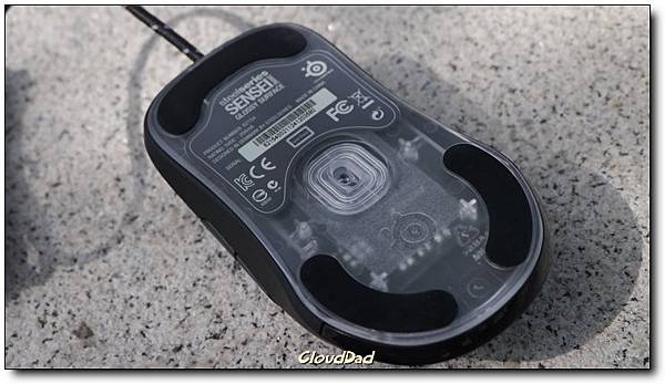 背面擁有三塊超大黑色鐵氟龍材質鼠貼,使用毛玻璃質感的霧面塑膠做底,怎麼看他都有發光的趨勢
