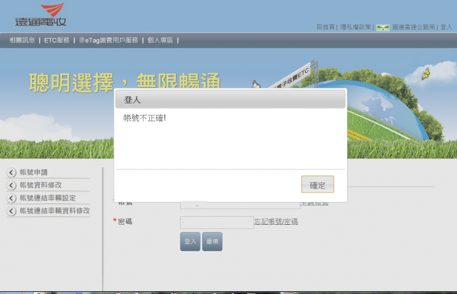 遠通的網站不是修好了嗎?怎麼剛才又連不上去了這幾天又爆出重覆扣款的事件!!讓我不得已開始每天記錄自己上下高速公路的資料,深怕沒記下來被多收錢剛才看新聞竟然遠通電收說...會重覆感應到是電子收費系統的宿命...真好笑可以再精密一點嗎?