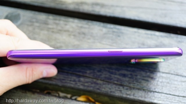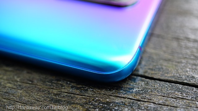 採用曲面玻璃背蓋設計的背面,其中「霧光漸變」是使用霧面蝕刻工藝,讓玻璃表面帶著磨砂質感,除了能減少指紋附著外,從左到右分別從紫到藍的變色,從不同角度下觀看,就會展現不同的色彩,而這樣的顏色搭配,我個人是覺得蠻有質感的。