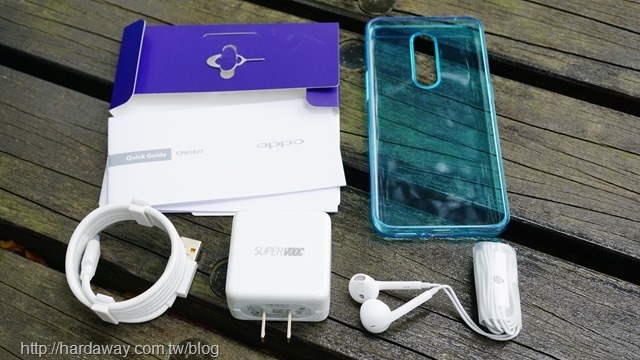 隨附的配件,包括了Super Vooc充電器、USB Type-C傳輸線、USB Type-C耳機、退孔針、矽膠保護殼與使用說明書。