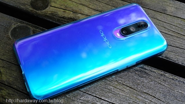OPPO R17 Pro裝上這個矽膠保護殼後,還是可以看得出霧光漸變的變化。另外,這時主相機突出部分,也會比保護殼來得低了。