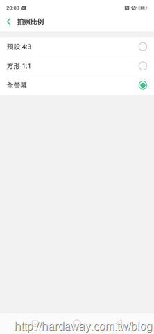 OPPO R17 Pro的照相比例,只有4:3、1:1與全螢幕三種可以選擇。另外,相機設定中有一個一定要啟用的,就是版本已經到2.1版的AI智慧場景辨識功能。