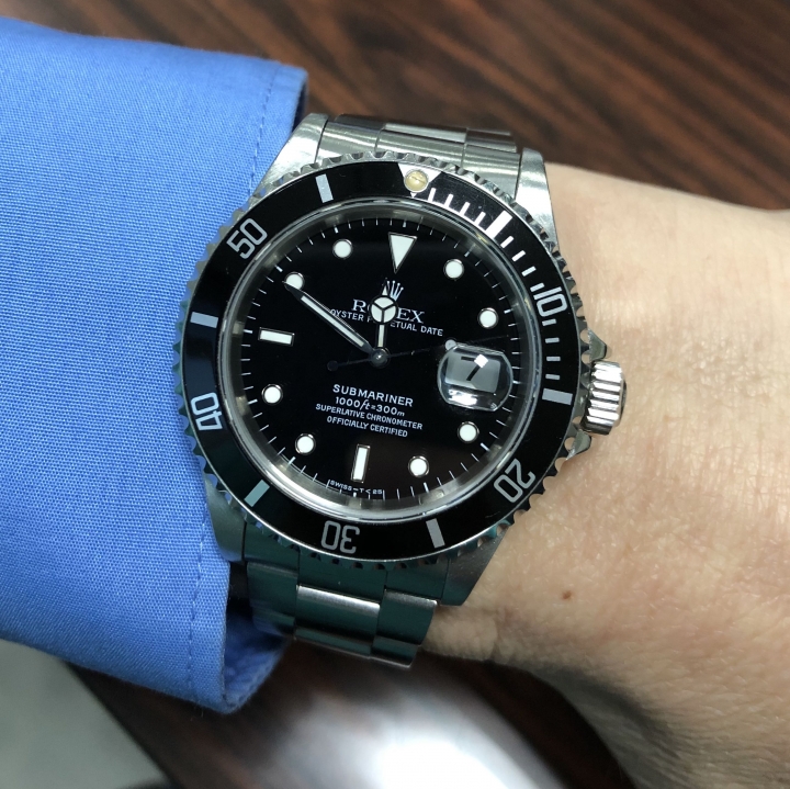 各位版友大家好,我以前從沒想過買的起,跟從沒想過要買勞力士的錶,即使經濟能力越來越好,達到可以買的起的狀態也一樣,5年前認識一位同行朋友,他非常的懂錶,常常跟我講勞力士怎樣怎樣,我都回他:啊不就是看時間,花那麼多錢買錶幹嘛? 他都回:可以保值,每個人的價值觀不一樣~。就這樣我經過錶店時,常有意無意去看看錶,前年10月入手人生第一隻機械錶(OMEGA),是我那位朋友告訴我是007系列,當時我根本不懂,我只是單純覺得好看就買了,然後他說:你以後一定會想買勞,我說:不會啦。一年過去了,有朋友幫我投資賺了些錢,有一筆40萬的分紅,一開始因為不喜歡日期那邊凸凸的,所以一直在看沒有日期功能的黑水鬼,後來看到朋友戴潛艇系列覺得好看,11/24去到了大阪難波的錶店,忽然看到GMT藍黑色,就這樣陷入四選一的狀態,後來覺得既然預算有40萬,加上藍黑色越看越覺得美,也不管日期那邊凸凸的事,就買了(去年3月才1127778日幣),11/24那天已經漲到1387038日幣,因為是付現,所以店家算我1375000日幣,真心覺得買勞要配錶這件事很鳥,有種被硬上的感覺XD,除非也喜歡配的錶,所以我寧願買超定價的錶。自從入手後,常不自主的會去摸錶面XD,有種自我肯定的感覺,靠自己打拼獲得的一切,那種實在感,真的很開心!~此錶的開箱文有版友分享過,所以我就不分享了,我分享的是一些實際戴在手上的照片跟價格。